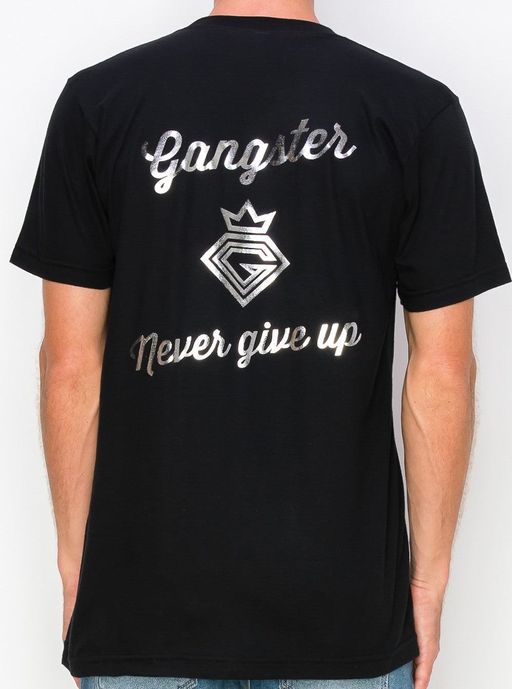 Black T-Shirt, Silver Foil print, Never Give Up Back Print.