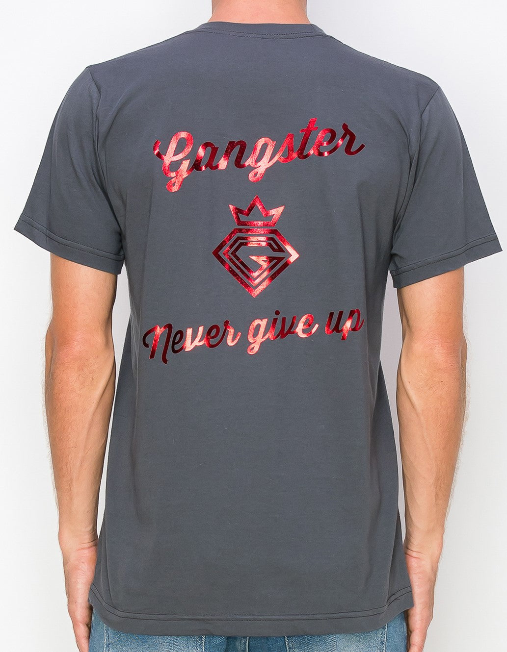 T-Shirt, Red Foil Print, Never Give Up Back Print.