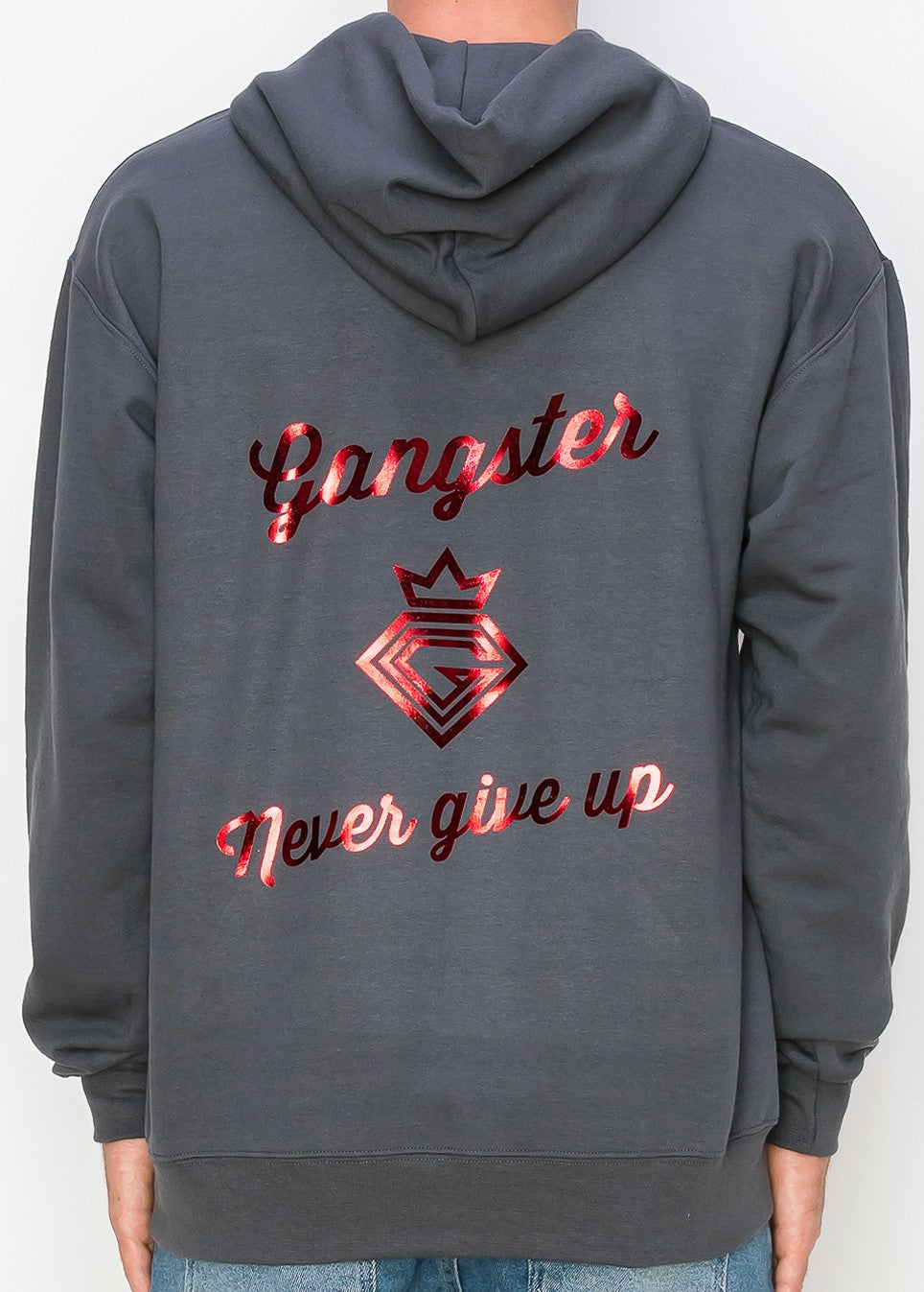 Grey Hoodie, Red Foil print, Never Give Up Back Print.